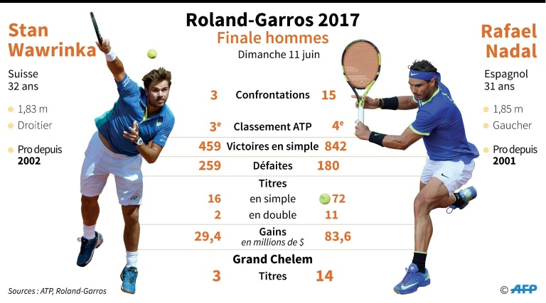 Rafael Nadal paraît invincible sur la terre battue de Roland-Garros où il cherchera à remporter un dixième titre dimanche, mais son adversaire Stan Wawrinka est lui invaincu en trois finales de Grand Chelem, dont une à Paris en 2015.