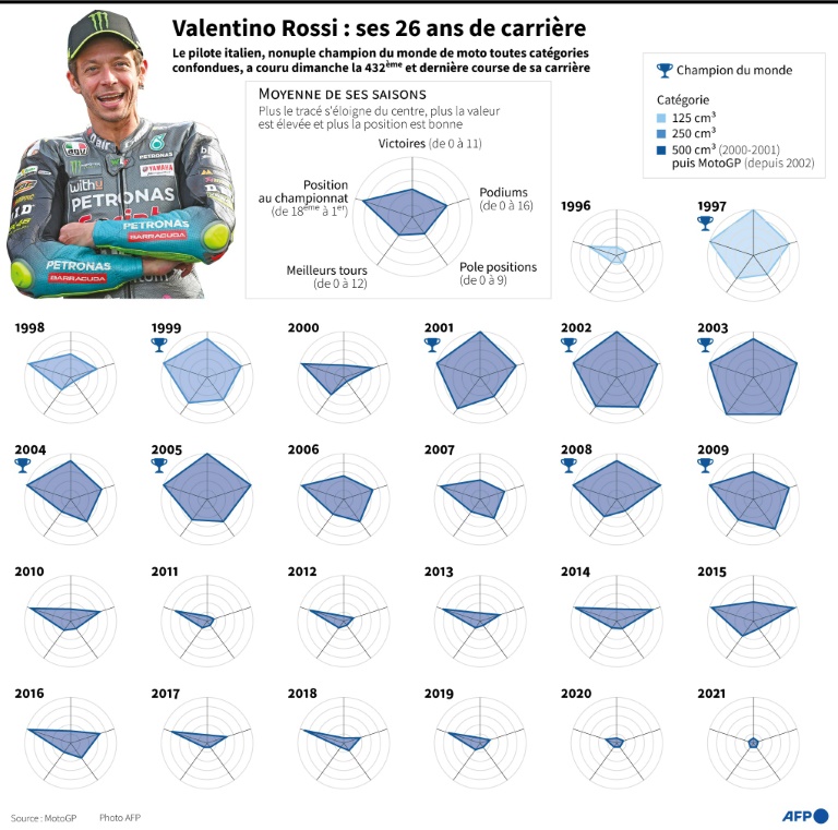 Après un 432e Grand Prix toutes catégories mondiales confondues depuis 1996, achevé à une 10e place anecdotique, le nonuple champion du monde a dit adieu à son sport, l'ayant fait grandir au point de l'incarner comme aucun autre pilote. Le Français Fabio Quartararo (Yamaha), 5e dimanche, s'étant déjà assuré de son premier titre mondial depuis deux courses, la fête était pour Rossi ce week-end.