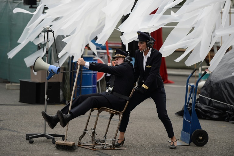 Dans une ambiance de hall d'aéroport, le public embarque place de la Petite-Hollande, en plein coeur de Nantes, pour un vol "Royal Airlines" d'une heure et demie. Après avoir libéré la piste d'un tapis de verres de vin rouge, le pilote assis sur une chaise à ressorts s'endort aux commandes de son manche à balai.