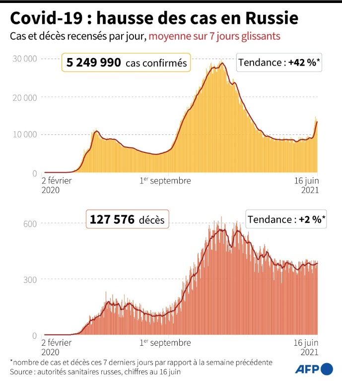 Le pays a enregistré en outre 453 décès supplémentaires, un pic depuis le 18 mars, et Moscou déplore 78 nouveaux morts. En cause, une campagne de vaccination qui patine, les Russes se méfiant massivement des vaccins développés dans le pays, l'absence de restrictions depuis des mois, l'émergence d'un ou plusieurs variants plus virulents et le non-respect des règles de distanciation et du port du masque. Face à cette réalité, les autorités moscovites ont commencé à réintroduire des restrictions.