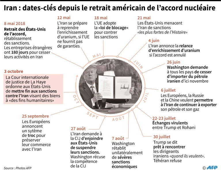 Accusant les Etats-Unis d'"étrangler" son économie, l'Iran a entamé une bataille judiciaire devant la CIJ après la réimposition par Donald Trump de sanctions unilatérales sévères contre Téhéran, suspendues depuis l'accord international sur le nucléaire iranien conclu en 2015. Le président américain a retiré en mai son pays de cet accord signé par l'Iran et les grandes puissances, dans lequel la République islamique s'engage à ne pas chercher à se doter de l'arme atomique.