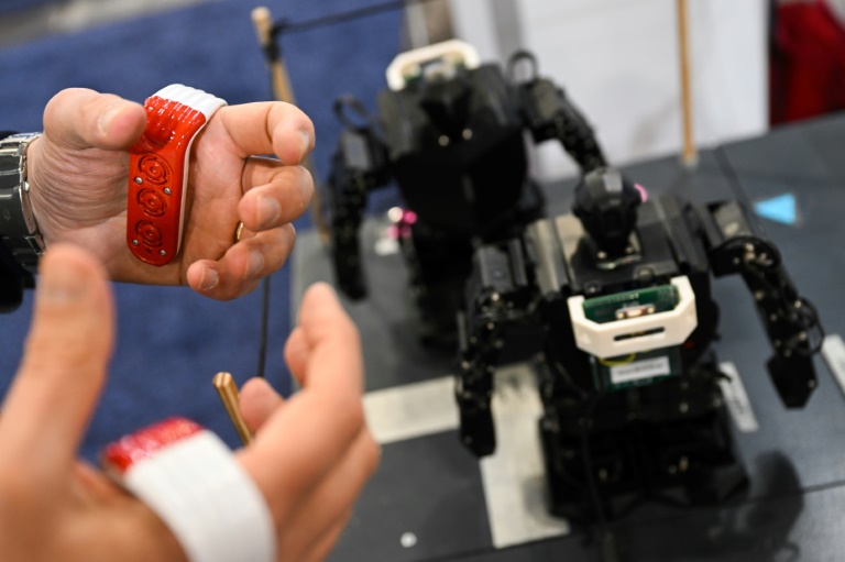 Au stand de Tactigon (Next Industries), Nadia Giuliani se place derrière un petit robot, se saisit de deux manettes connectées et frappe dans ses mains en disant "clap".
