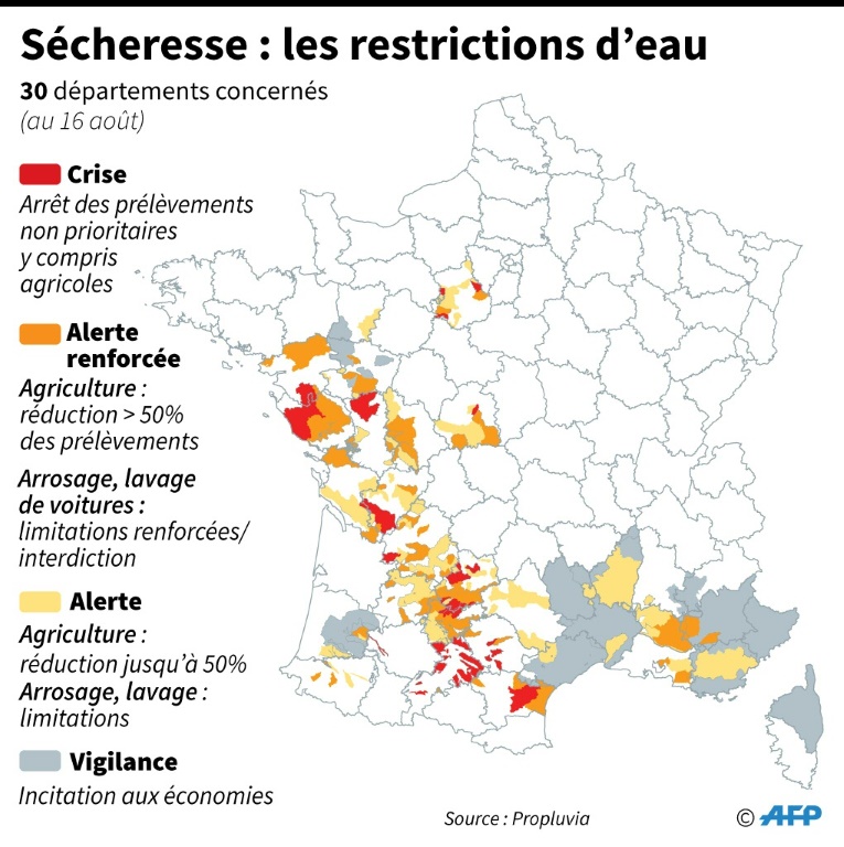 Les restrictions les plus sévères ont été décidées dans 14 départements situés pour la plupart dans le Sud-Ouest et dans l'Ouest, au sud de la Bretagne.