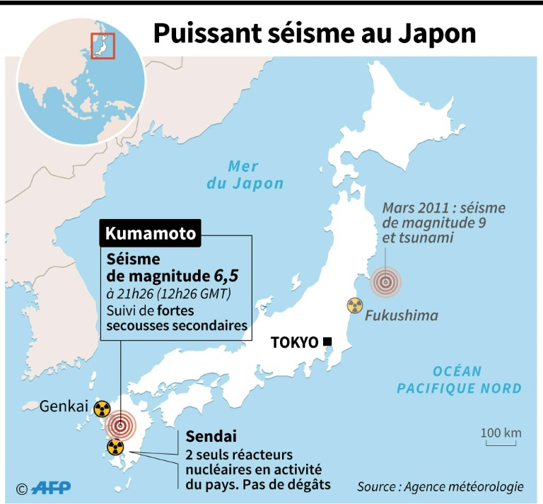 Un avis de risque de tsunami a été émis dans la nuit de vendredi à samedi au Japon par l'agence de météorologie après un nouveau fort séisme dans le sud-ouest.