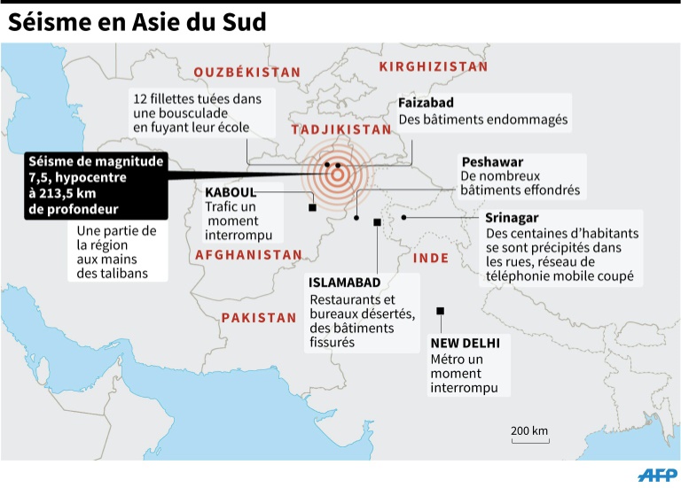 En Afghanistan, le séisme, dont l'épicentre se trouvait dans les montagnes du Badakhshan (nord-est), avait généré lundi une scène d'horreur dans la ville de Talogan: 12 écolières prises de panique ont péri dans une bousculade alors qu'elles tentaient de fuir leur école.