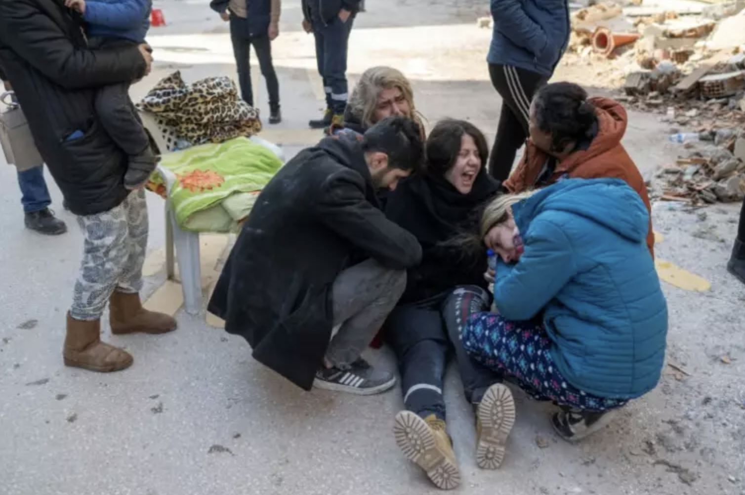 Dans le village de Besnaya, à la frontière avec la Turquie, Malik Ibrahim déblaye sans relâche les décombres, à la recherche de trente membres de sa famille, tous ensevelis sous les ruines. Dix corps sans vie en ont déjà été retirés.