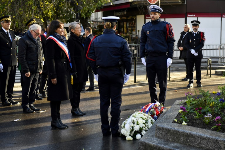 Mme Borne était entourée dimanche notamment de la maire de Paris Anne Hidalgo et des présidents des associations de victimes Life for Paris Arthur Dénouveaux, et 13onze15 Philippe Duperron.