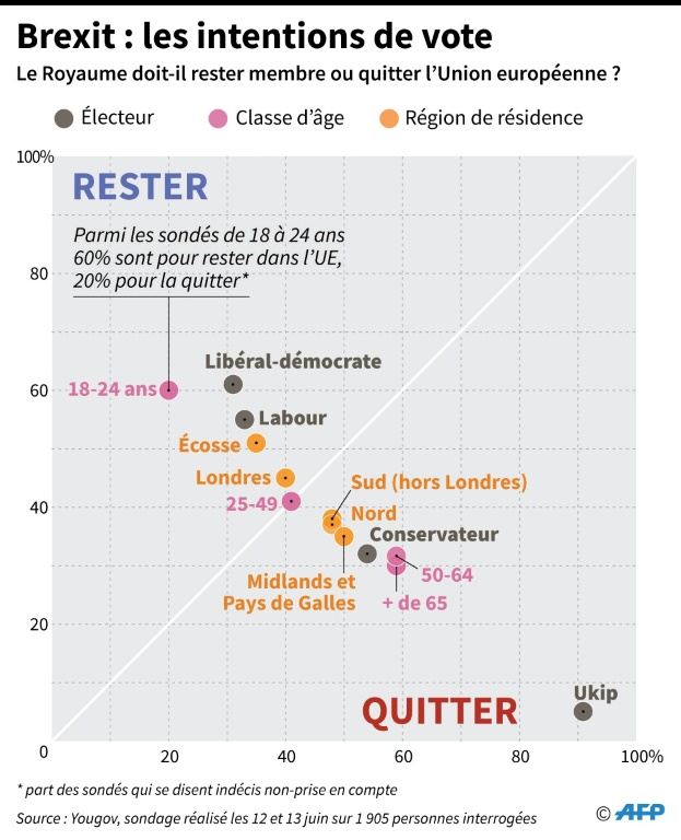 Mais l'inquiétude s'installe, que ce soit dans les salles de marché de la City de Londres ou les couloirs de Bruxelles, même si le président de la Commission européenne Jean-Claude Juncker a estimé que l'Union européenne ne sera pas "en danger de mort" si le Brexit l'emporte.