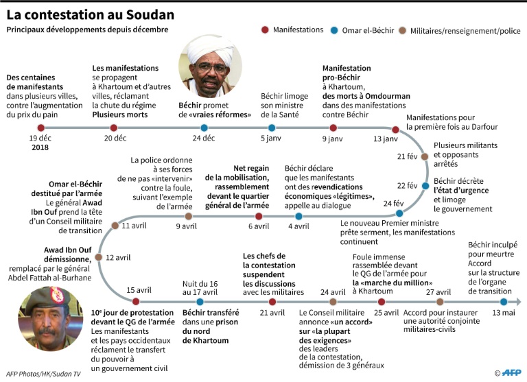 Au pouvoir depuis près de 30 ans, le président Béchir a été destitué à l'issue d'une série de manifestations populaires qui ont débuté le 19 décembre, après la décision du gouvernement de tripler le prix du pain dans un pays à l'économie exsangue.