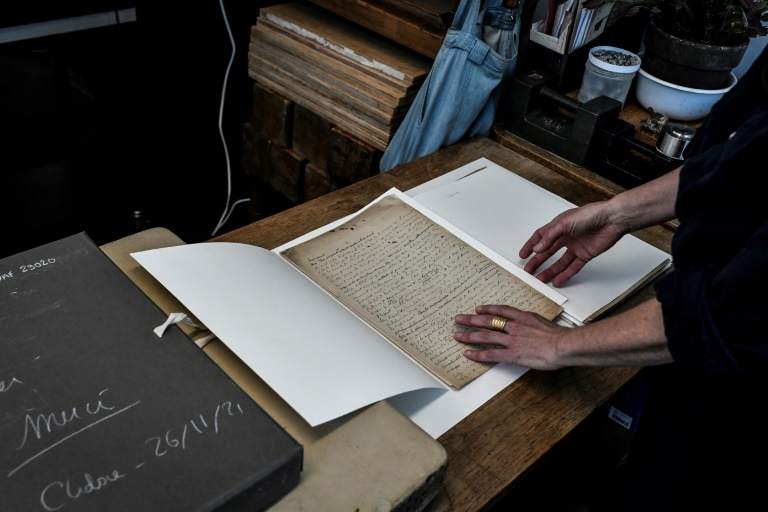 Ce trésor longtemps méconnu est confié à Frédérique Pelletier, dans un atelier sous les toits de la BnF rue de Richelieu, en plein centre de Paris. "On va effectuer des restaurations minimalistes, pour bloquer les problématiques de déchirures et de lacunes", dit-elle, en collant des morceaux de papier japonais ultra-léger (2 g/m²).