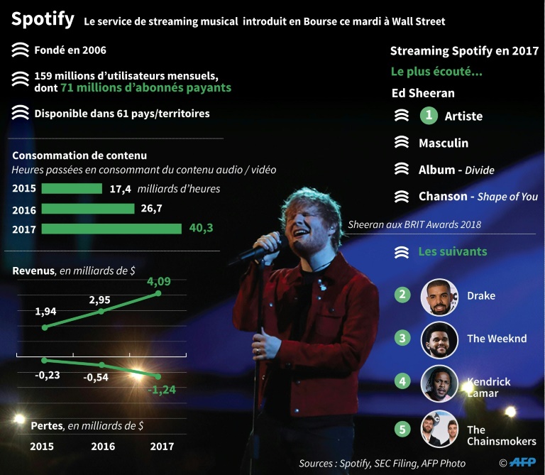 Le suĂ©dois Spotify, numĂ©ro un mondial de la musique en streaming, fait ses premiers pas en Bourse mardi Ă New York, au moment oĂč --hasard du calendrier-- les valeurs technologiques connaissent une passe difficile sur les marchĂ©s. MalgrĂ© 71 millions d'abonnĂ©s payants et le boom de l'Ă©coute musicale en ligne, le groupe qui a rĂ©volutionnĂ© ce marchĂ© n'a jamais engrangĂ© le moindre bĂ©nĂ©fice. Mais il jouit d'une confortable avance sur ses concurrents, Apple Music, numĂ©ro deux avec moitiĂ© moins d'abonnĂ©s, ou encore Google Music, Tidal, Deezer ou Amazon. Spotify sera cotĂ© sous le symbole "SPOT".