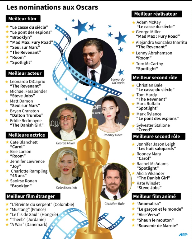 "The Revenant" et "Mad Max" ont pour principaux adversaires la saga journalistique "Spotlight", dénonçant la pédophilie dans l'Eglise et "The Big Short: Le casse du siècle", sur la crise financière.