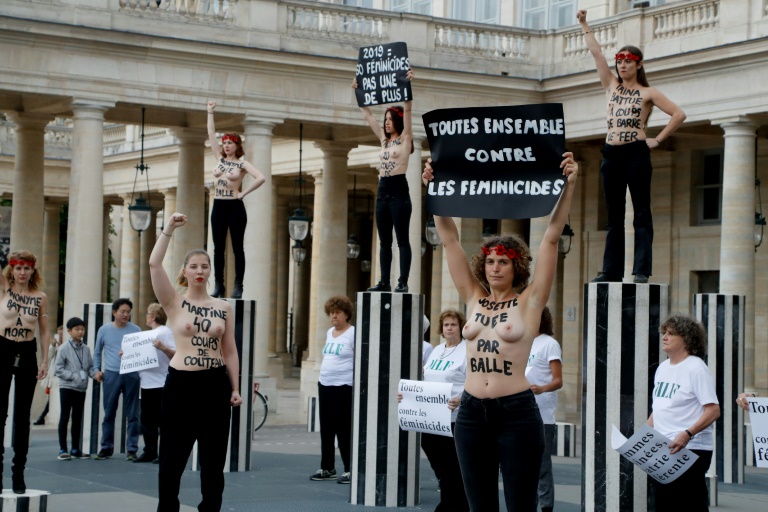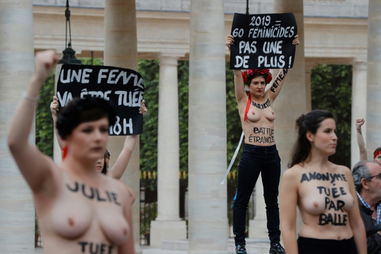 Une soixantaine de militantes du mouvement Femen ont brièvement investi jeudi matin la cour du Palais-Royal, en plein coeur de Paris, pour "rendre hommage" aux quelque 60 femmes "assassinées" depuis le début de l'année et dénoncer "l'indifférence du gouvernement", a constaté un journaliste de l'AFP.