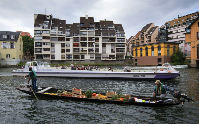 "J'ai toujours vécu au bord du Rhin Tortu (bras de l'Ill). Les commerces strasbourgeois étaient nombreux à se faire livrer par voie fluviale à la fin du 19e siècle. Alors je me suis dit : pourquoi ne pas renouer avec les traditions ?", raconte à l'AFP Christophe Moegling, 57 ans, gérant du Petit Marché d'Alsace et propriétaire de l'embarcation en bois du marché flottant inauguré le 2 septembre.
