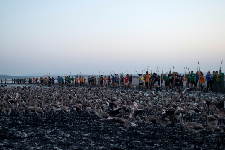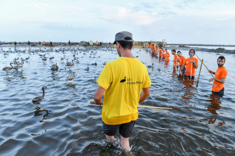 Le soleil se lève à peine à l'horizon: 150 bénévoles encerclent doucement dans un des étangs des salins d'Aigues-Mortes (Gard) des centaines de poussins flamants roses qui doivent être bagués pour protéger cette espèce emblématique des zones humides, menacées à travers le monde.