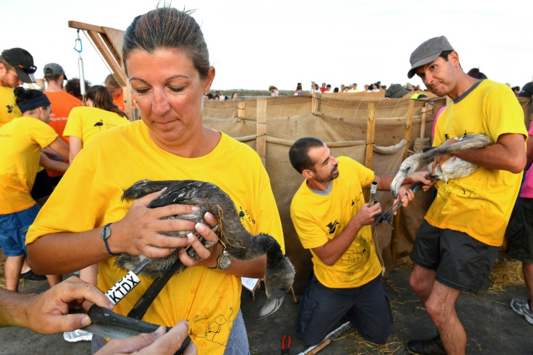 "Ce matin, nous avons bagué environ 675 poussins, ce qui consiste à leur apposer deux bagues, l'une métallique qui contient un numéro unique provenant du Muséum d'histoire naturelle et une en PVC qui contient un numéro alphanumérique unique qui identifie chaque individu et qui est lisible à distance", explique à l'AFP Jean Jalbert, 57 ans, directeur de la Tour du Valat."Depuis 41 ans, on a pu grâce à ces bagues suivre individuellement les flamants un peu partout là où ils se répartissent", notamment autour du bassin méditerranéen, poursuit-il.