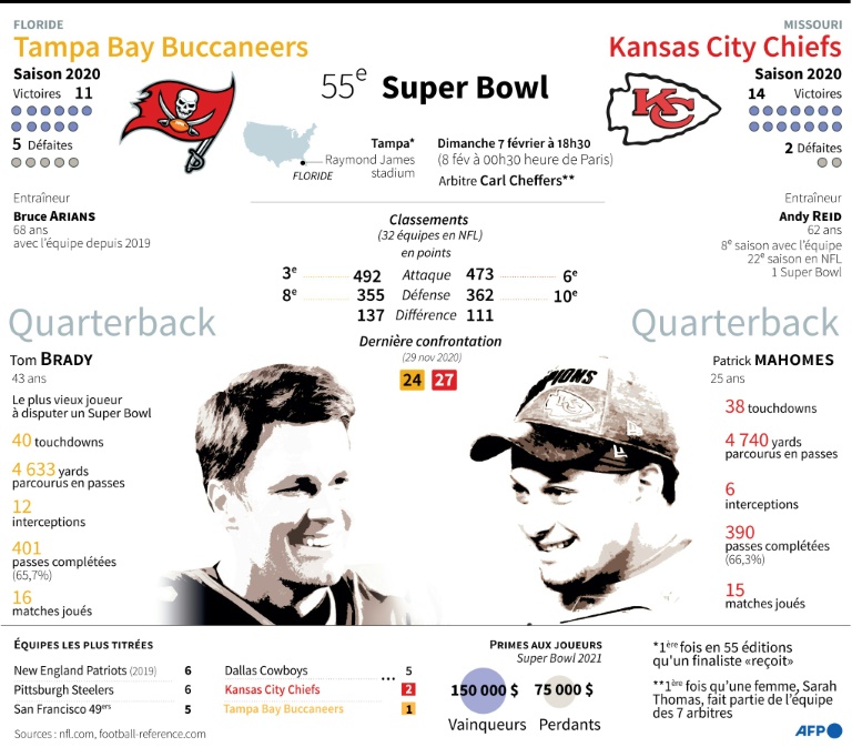 De quel côté penchera la force ? Le 55e Super Bowl, au casting galactique, opposera à Tampa (Floride) les Chiefs du phénomène Patrick Mahomes, en quête d'un 2e sacre d'affilée, aux Buccaneers du légendaire Tom Brady, qui brigue un 7e titre personnel.