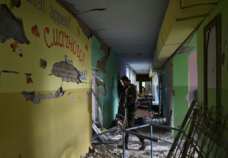 A une poignée de kilomètres du front sud, dans la région de Mykolaïv, les ruines d’une école incarnent les destructions infligées par la Russie à l’éducation ukrainienne. Quelques peluches gisent au sol. De petits pupitres sont couverts de gravats tombés du plafond.