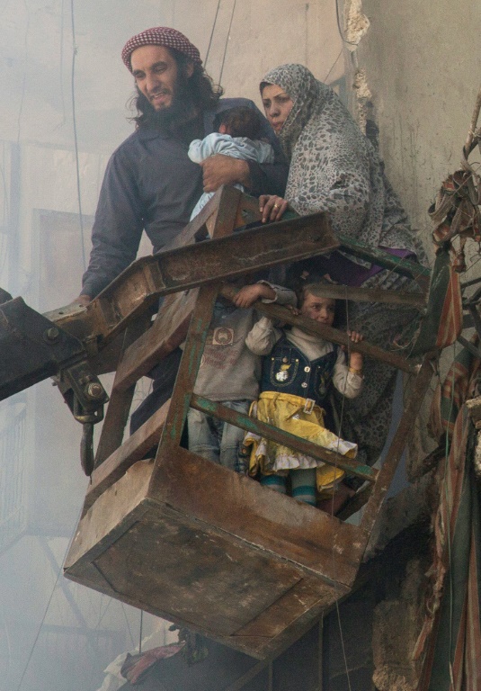 Les secouristes se sont activés à sortir les gens bloqués dans les immeubles endommagés par les frappes; un membre de la défense civile a fait descendre par une échelle une femme d'un immeuble endommagé alors qu'un autre volontaire a réussi à évacuer avec une grue un jeune homme portant un enfant dans ses bras d'un étage supérieur d'un immeuble défiguré par la frappe.