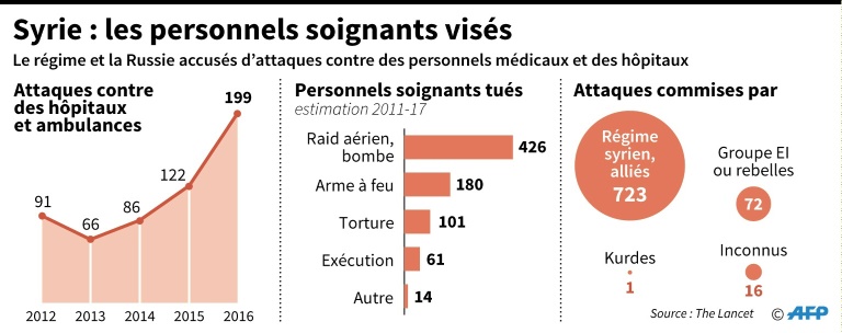 Selon des chiffres fournis par l'ONG américaine Physicians for Human Rights (PHR), 782 soignants ont été tués entre mars 2011 et septembre 2016, auxquels sont venus s'ajouter 32 décès survenus entre octobre 2016 et février 2017, selon les chercheurs. Sur les 782 tués, 55% l'ont été dans des bombardements, 23% lors de fusillades, 13% à la suite de tortures tandis que 8% ont été exécutés. La profession médicale a été la plus touchée, les médecins représentant 32% de tous les tués, selon l'étude.