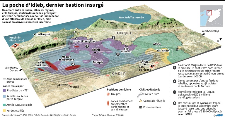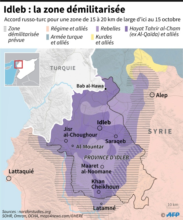 L'accord russo-turc conclu à Sotchi (Russie) le 17 septembre prévoit une "zone démilitarisée" pour séparer les territoires du régime de Bachar al-Assad de ceux encore tenus par les rebelles et jihadistes. Selon cet accord, les armes lourdes des groupes rebelles et jihadistes devaient être retirées avant le 10 octobre, tandis que les jihadistes avaient jusqu'au 15 octobre pour quitter la zone tampon. La première échéance a été globalement respectée, pas la seconde.
