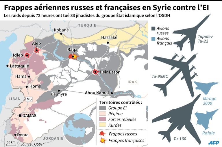 Les frappes syriennes et russes ont particulièrement visé la région de Palmyre et le village de Mahin. De violents combats au sol ont également éclaté dans plusieurs secteurs de Mahin et ses alentours entre les forces du régime du président syrien Bachar al-Assad et les jihadistes, selon l'OSDH qui s'appuie sur un large réseau de sources à travers la Syrie.