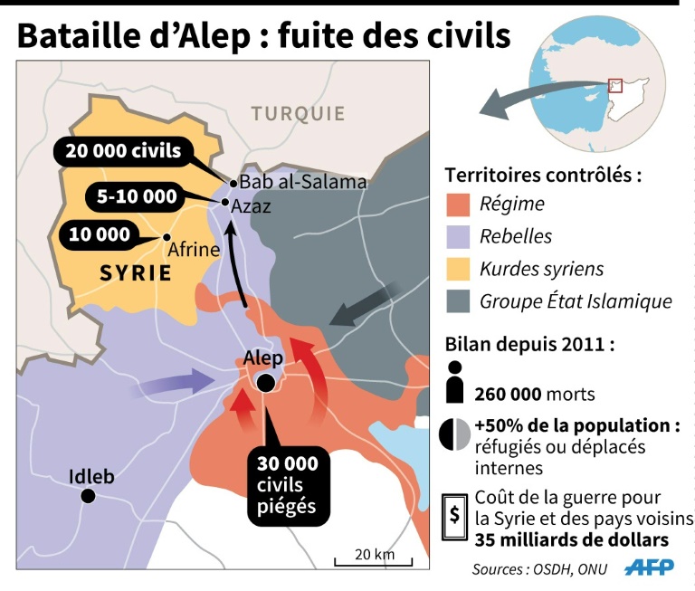 Selon les derniers chiffres fournis vendredi par l'ONU, 20.000 personnes se bousculent déjà face à Oncupinar, dans la ville syrienne de Bab al-Salama. L'Observatoire syrien des droits de l'Homme (OSDH) a pour sa part estimé à près de 40.000 le nombre des civils contraints depuis lundi à l'exode par les combats.