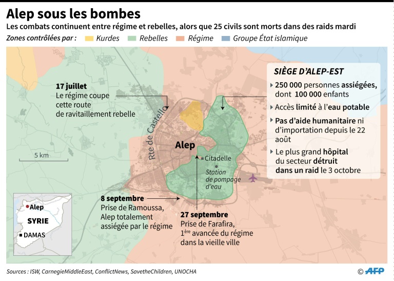 Sur le terrain, des frappes aériennes et des tirs d'artillerie visant des zones rebelles d'Alep ont tué au moins sept personnes, selon l'Observatoire syrien des droits de l'Homme (OSDH).