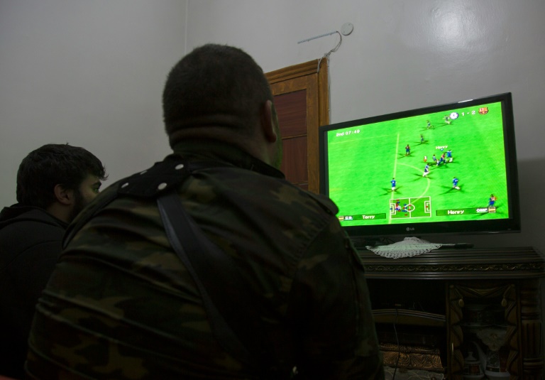Leurs armes posées sur un matelas pour cause de cessez-le-feu, deux rebelles syriens en treillis, Tarek Mehrem et son copain, affalés sur le divan d'une maison sur la ligne de front à Alep (nord), s'adonnent à des jeux vidéos.