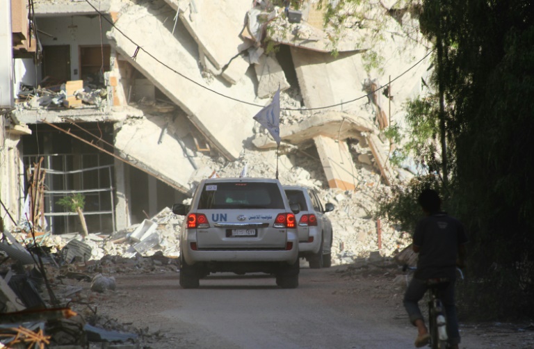 Le Conseil local de Daraya, tenu par les rebelles, a posté une vidéo qui montre des véhicules de l'ONU au moment de leur entrée à la tombée de la nuit dans la ville.