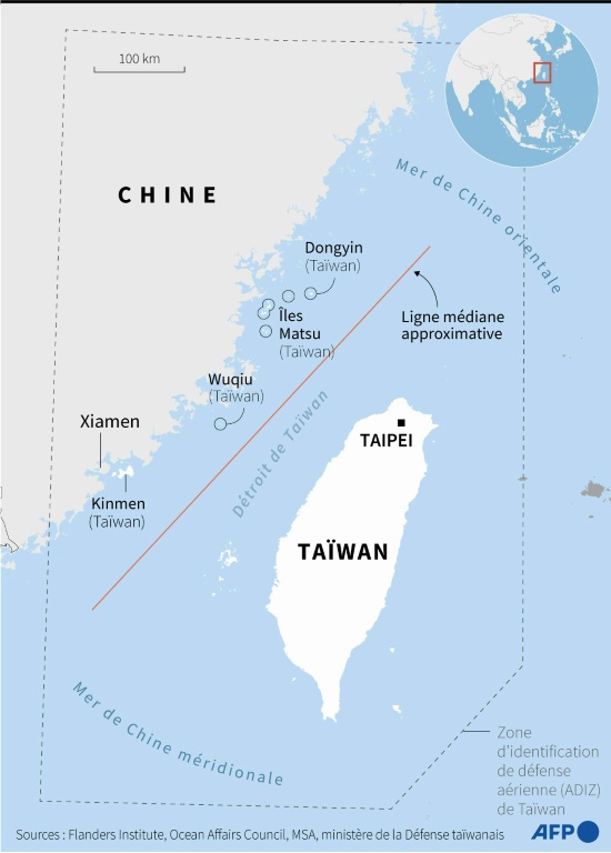 Jeudi, quatre navires de garde-côtes chinois ont "navigué dans les eaux (de Taïwan)" à 07H00 (23H00 GMT), ont indiqué les garde-côtes de Taipei, ajoutant qu'ils avaient quitté les lieux deux heures plus tard.