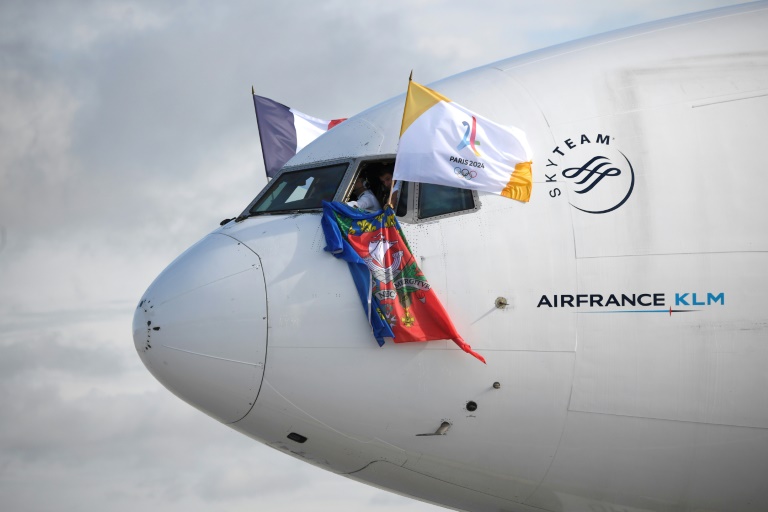 Avant d'immobiliser l'appareil, les pilotes ont déployé les drapeaux de la France, de Paris-2024 et de la ville de Paris à travers les vitres du cockpit, tandis que des lances à eau saluaient le retour de la délégation.