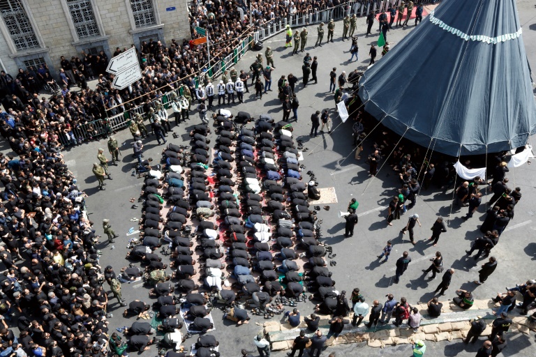 Dans le Grand Bazar de Téhéran, en pleine célébration d'Achoura, une foule habillée de noir regarde une pièce de théâtre retraçant un chapitre clé de l'histoire des chiites. Ailleurs, des jeunes arborant tatouages et jeans déchirés assistent à une procession en hommage à l'imam Hussein. Chaque année, autour du 10e jour du mois musulman de Moharram, les chiites, majoritaires en Iran, célèbrent le deuil d'Achoura qui marque l'anniversaire du martyre de l'imam Hussein, le troisième successeur du prophète, vénéré par les musulmans chiites.