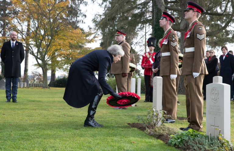 Dans le cadre des commémorations du centenaire de l'Armistice, Theresa May faisait étape en Belgique avant de rejoindre dans la journée le président français Emmanuel Macron dans le nord de la France, sur un autre champ de bataille de la Grande guerre.