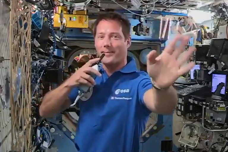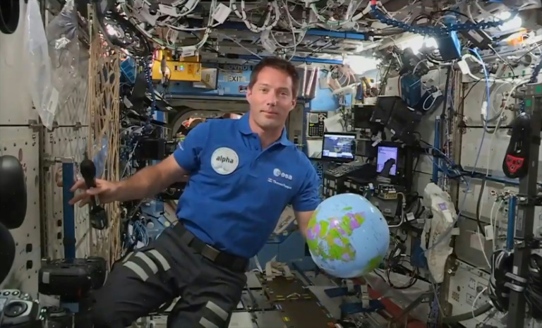 Flottant en apesanteur, et tout en jouant avec une mappemonde gonflable, l'astronaute s'est prêté à 20 minutes de questions-réponses, depuis un module encombré de câbles et de fils de la Station, où il a déjà passé plus de six mois en 2016-2017.