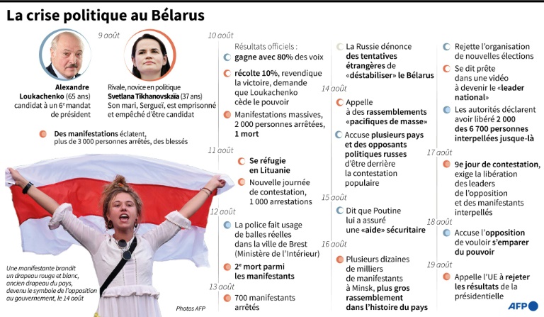 Déclaré vainqueur avec plus de 80% des voix, M. Loukachenko, au pouvoir depuis 1994, fait face à une pression croissante tant au Bélarus, où se déroulent des manifestations quotidiennes et un mouvement de grève touchant des industries vitales à l'économie du pays, qu'à l'étranger.