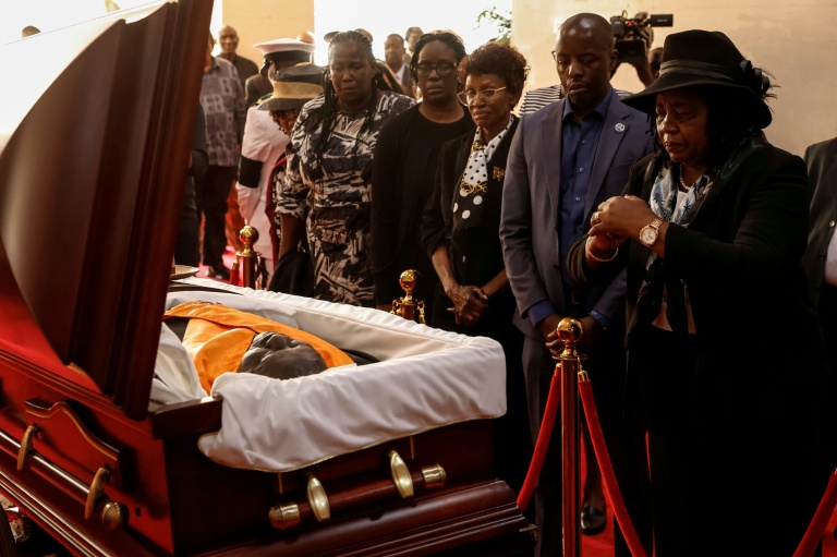 Après le chef de l'Etat, Ida Odinga, la veuve de l'opposant historique, s'est recueillie quelques instants son mari allongé dans un cercueil ouvert, le haut du corps recouvert d'un tissu orange, la couleur de son parti, et sur lequel avait été posé un large chapeau emblématique.