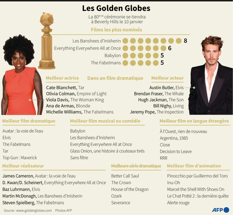 L'intimiste "The Fabelmans" de Steven Spielberg, le biopic "Elvis" ainsi que les deuxièmes volets des mastodontes "Top Gun" et "Avatar" s'affrontent mardi aux Golden Globes, lors d'une cérémonie où ces récompenses tenteront de redorer leur image, largement ternie par les scandales entourant le jury.