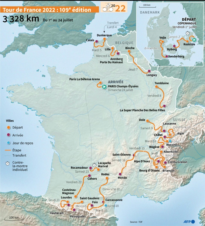 Une séquence de pavés au retour dans le nord de la France, les Alpes avant les Pyrénées, un long contre-la-montre de 40 kilomètres dans le Lot à la veille de l'arrivée sur les Champs-Elysées programmée le 24 juillet: plusieurs temps forts sont identifiés dans ce 109e Tour qui comporte sa part de nouveautés (trois jours au Danemark, le col pyrénéen de Spandelles) et de grands classiques.