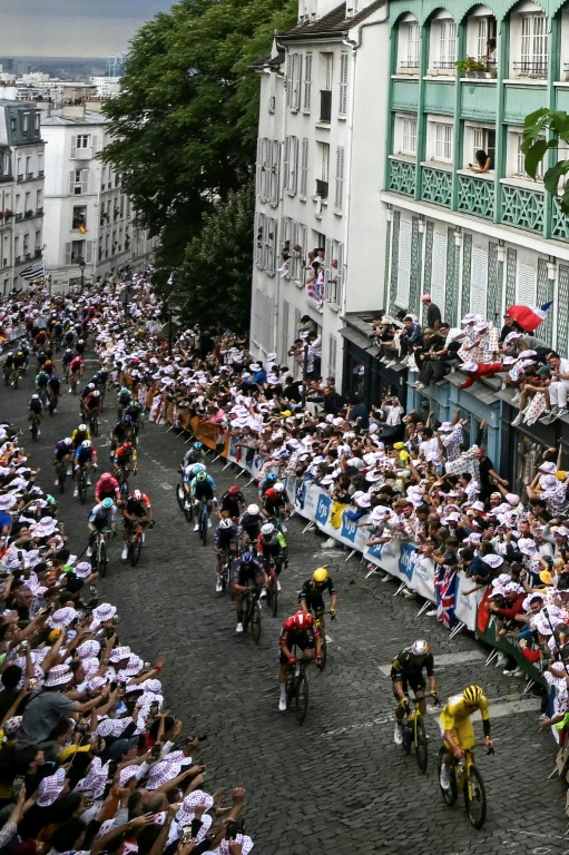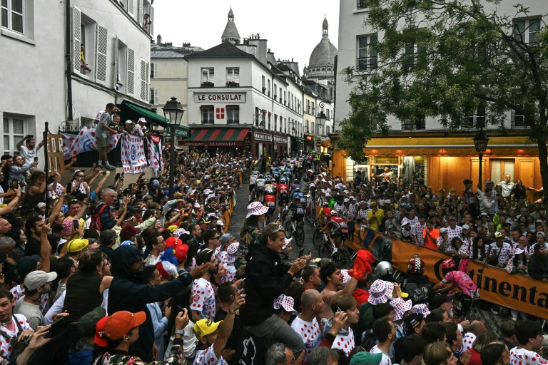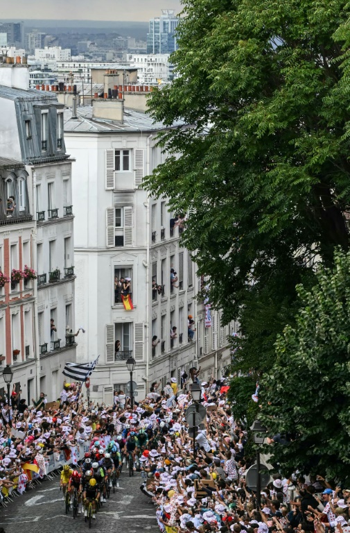 Chaises pliantes, canettes de bière, maillots jaunes et à pois, drapeaux aux fenêtres et déjà des vivats: dans la pente de l'emblématique rue Lepic de Montmartre, des milliers de supporters du Tour de France s'échauffent dimanche avant le passage du peloton en fin d'après-midi.