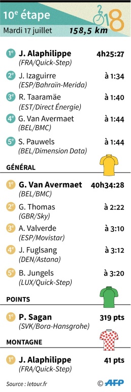 L'entrée dans les Alpes a coïncidé avec le premier succès français: Julian Alaphilippe a gagné la 10e étape du Tour de France, mardi au Grand-Bornand où le Belge Greg Van Avermaet a prolongé son bail avec le maillot jaune.