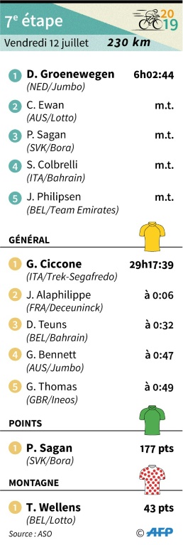 Les sprinteurs gagnent à tour de rôle: le Néerlandais Dylan Groenewegen (Jumbo) s'est adjugé la 7e étape du Tour de France, vendredi à Chalon-sur-Saône, sans conséquence sur le classement général mené par l'Italien Giulio Ciccone (Trek).