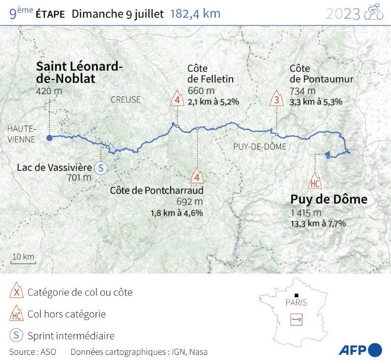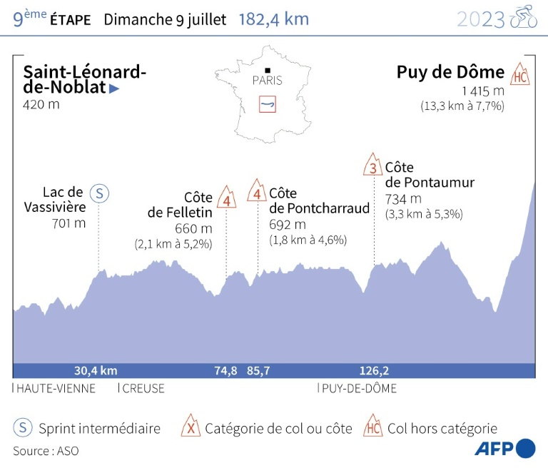 Toujours maillot jaune du Tour de France, le Danois Jonas Vingegaard devrait se frotter à nouveau à son dauphin slovène Tadej Pogacar lors de la 9e étape dimanche, au sommet du Puy de Dôme, un lieu déserté par le peloton depuis 1988 mais qui a marqué l'histoire de la Grande boucle.