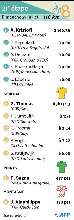Après le déboulé victorieux du Norvégien Alexander Kristoff (Emirats) dans la 21e étape, le scénario habituel s'est reproduit au bout du parcours de 3351 kilomètres. Pour la sixième fois depuis 2012, l'équipe la plus puissante du peloton a inscrit l'un des siens au palmarès de la plus grande course cycliste du monde: Bradley Wiggins (2012), Chris Froome à quatre reprises entre 2013 et 2016, et enfin Geraint Thomas, un Gallois de 32 ans jusqu'alors cantonné à un rôle de lieutenant.