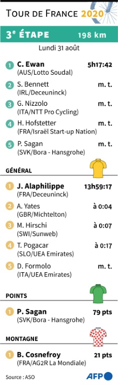 "Il me fallait trouver la bonne trajectoire pour prendre de la vitesse", a reconnu l'Australien, qui a vu l'ouverture avec l'instinct d'un (grand) sprinteur pour scorer dès le troisième jour du Tour. L'an dernier, il s'était imposé à trois reprises dans la seconde moitié de l'épreuve, pour sa première participation. Ewan a redonné ainsi sans attendre des couleurs à sa formation Lotto accablée en ce début de Tour. Deux membres de l'encadrement positifs au Covid avant le départ, mise hors délai de l'Allemand John Degenkolb au soir de la première étape, abandon du Belge Philippe Gilbert, rotule gauche fracturée, le lendemain matin: pour l'équipe belge, la victoire d'Ewan, la 5e de l'Australien cette saison, est plus que bienvenue.