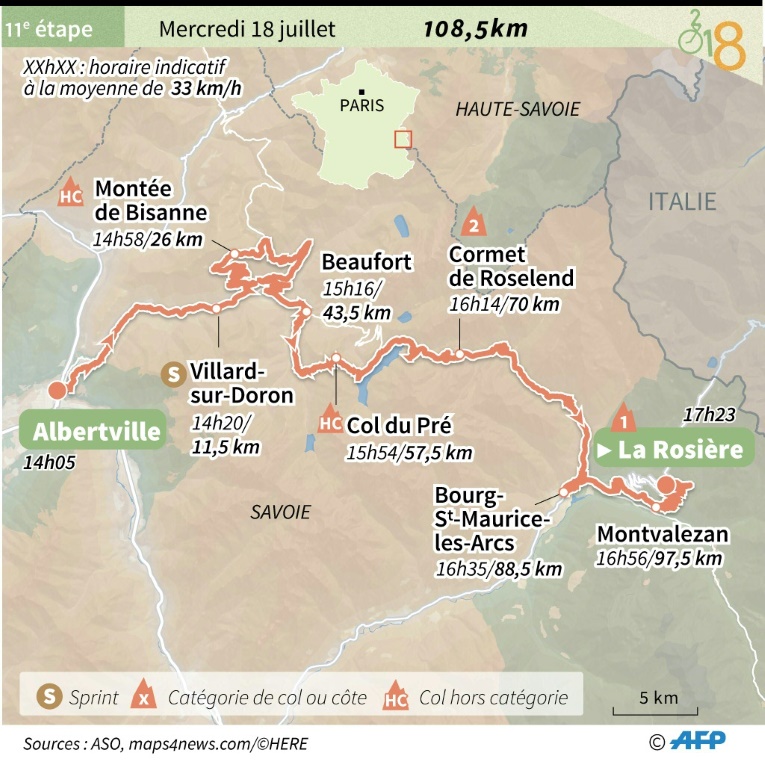 "Ce sont des classiques", souligne le directeur de course Thierry Gouvenou. A chaque fois, des efforts de longue haleine, des cols de grande dimension jusqu'à la montée finale des 21 virages pour rejoindre la station de l'Oisans. "C'est une étape qui ne déçoit jamais, surtout que nous y avons ajouté les somptueux lacets de Montvernier. Ce qui donne 65 kilomètres d'ascension", ajoute Gouvenou à propos d'un dénivelé positif global supérieur à 5.000 mètres. Après l'indigeste Madeleine (25,3 km à 6,2%) et Montvernier, l'interminable Croix-de-Fer (29 km à 5,2%) amène à la vallée de la Romanche et Bourg d'Oisans, pied de l'ascension terminale jusqu'à l'altitude de 1.850 mètres.