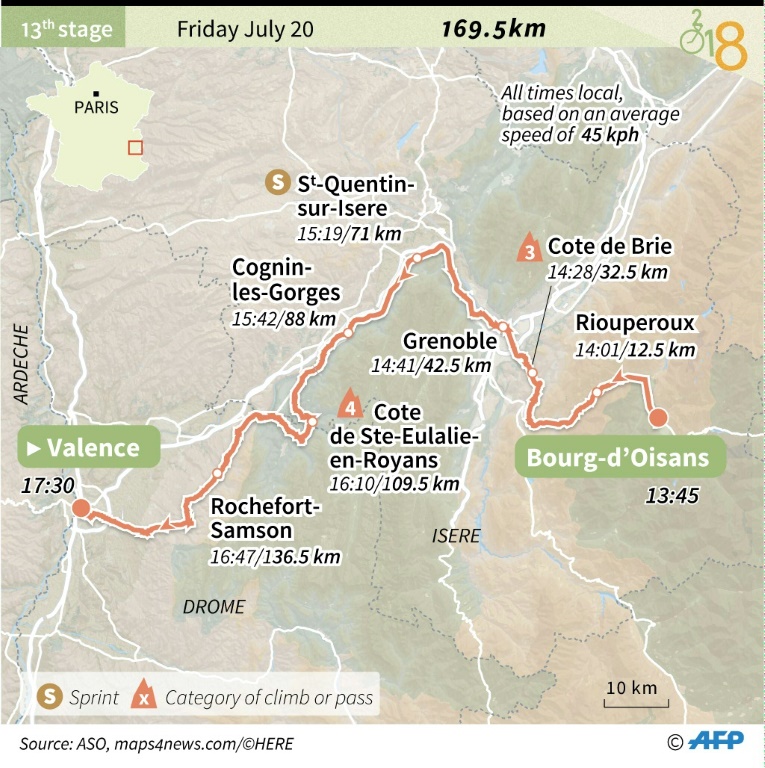 Le peloton des 152 coureurs du Tour de France a quitté vendredi en début d'après-midi les Alpes depuis Le Bourg-d'Oisans vers Valence pour une 13e étape longue de 169,5 kilomètres, sur un terrain à nouveau favorable aux sprinteurs.