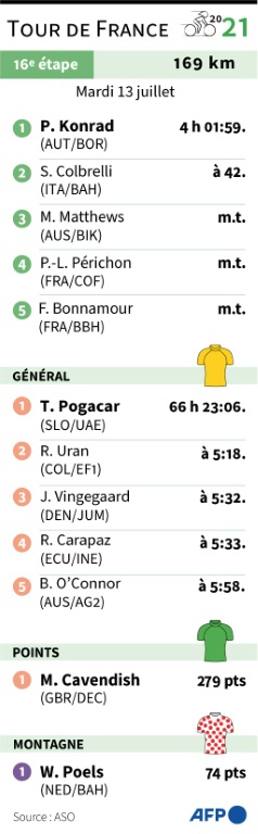 Troisième coureur de son pays à gagner dans le Tour (après Max Bulla en 1931 et Georg Totschnig en 2005), Konrad a remporté haut la main une étape de moyenne montagne offerte aux attaquants. Car, pour le classement général toujours commandé par le Slovène Tadej Pogacar, le rendez-vous est fixé à mercredi, jour de la Fête nationale, dans l'arrivée "la plus difficile des Pyrénées" selon Thierry Gouvenou, le traceur du Tour.