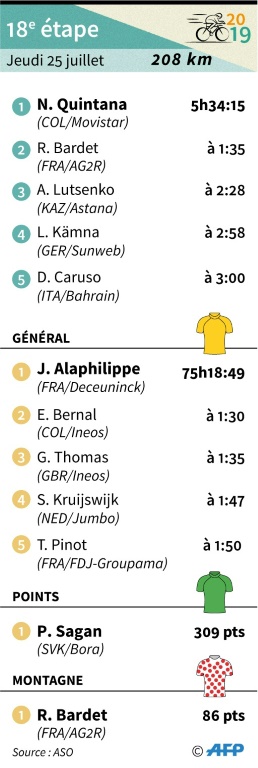 Jour de fête colombienne dans les Alpes: Nairo Quintana (Movistar) a gagné la 18e étape du Tour de France, jeudi à Valloire, où Egan Bernal s'est rapproché du Français Julian Alaphilippe (Deceuninck), toujours en jaune.