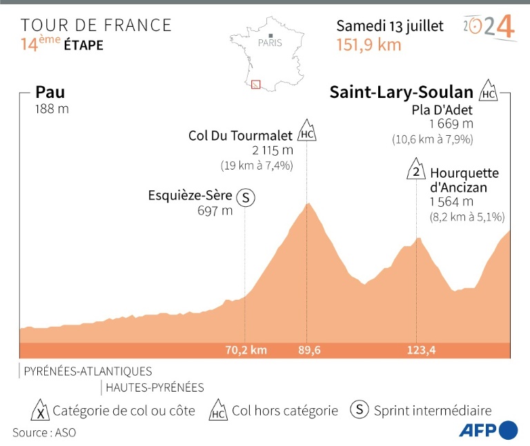 Samedi, après 70 kilomètres de mise en jambes au départ de Pau, le peloton va affronter trois ascensions consécutives lors des 80 km restants: le vénérable Tourmalet, Hourquette d'Ancizan et le Pla d'Adet, pour les 50 ans de la victoire de Raymond Poulidor qui a désormais sa statue au sommet à Saint-Lary.
